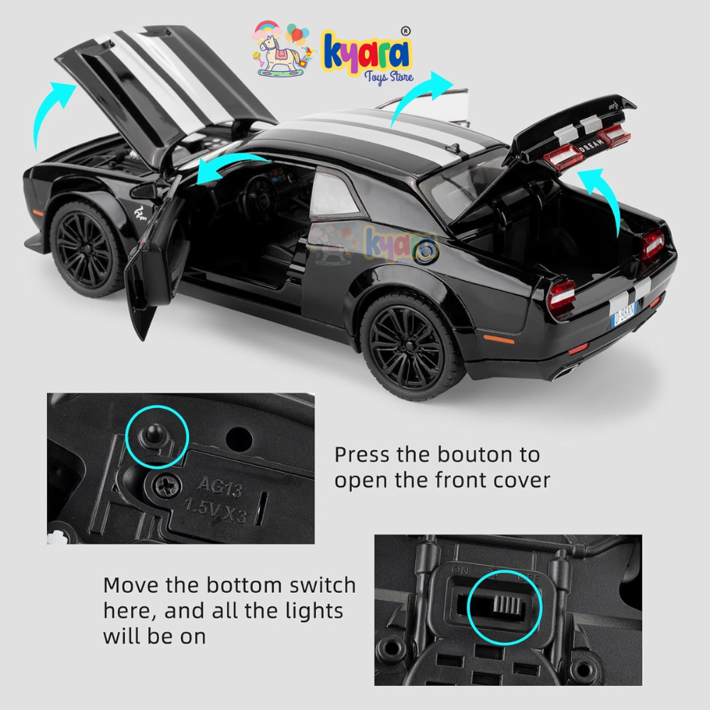 Pull Back Function : Our Hellcat model car rear wheels with strong pull back function, just pull the car back a distance, release the car will quickly move forward, increasing the interactive fun, the front wheels can be steered left and right, the real four-wheel drive flexible rotation;