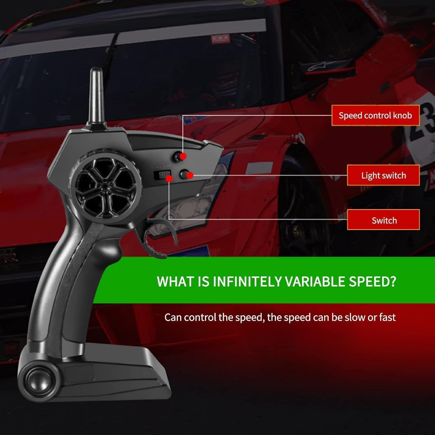 - Functions: Adopting a simulation structure design, it has a real car handling feel, achieving full proportional continuously variable transmission, high-speed driving, rapid acceleration, deceleration, braking, reverse, left turn, right turn.