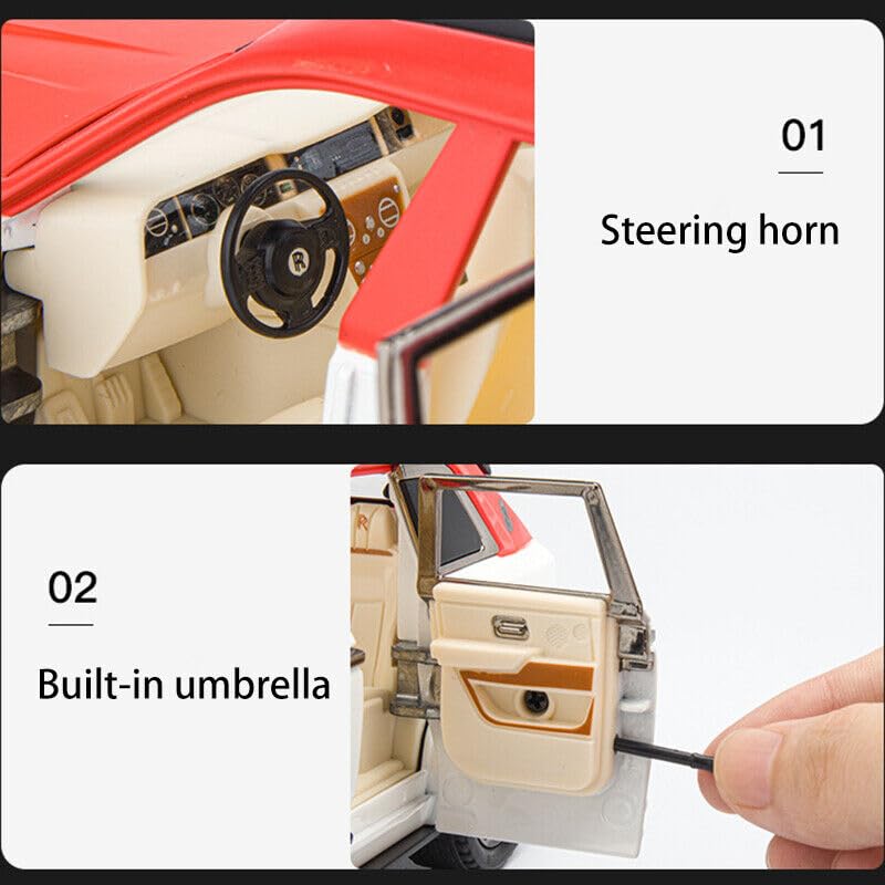 【ORIGINAL REPLICA】: Original Miniature Car Look, 2 Wheel Drive , Doors Can be Opened. Press the Car Bonnet to Trigger Light & Sound ,Front and Rear Lights Glow with Music.